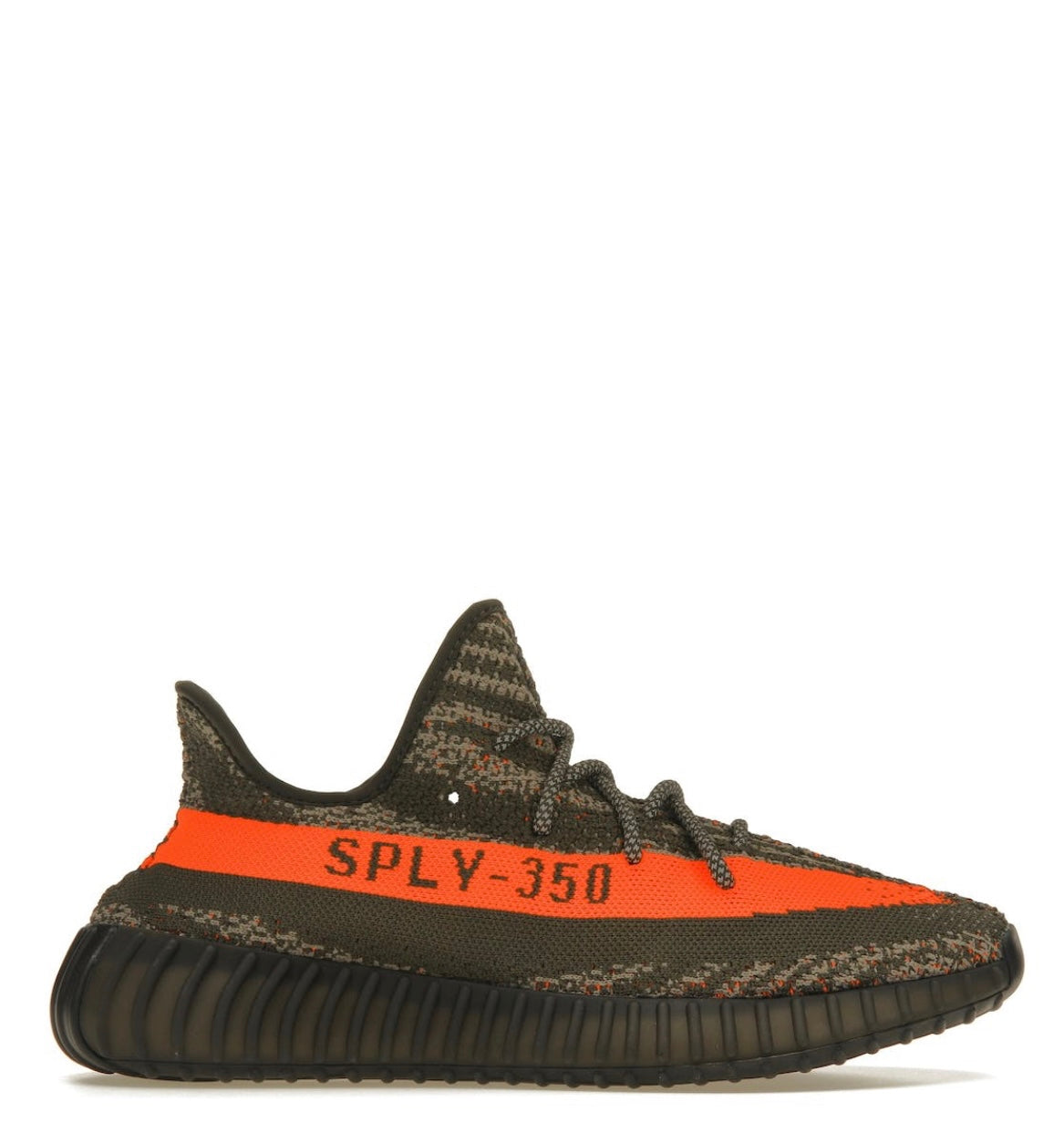 Adidas Yeezy 350 V2 Carbon Beluga har en grå och brun Primeknit-bas som har zebradetaljer. Vi kan se en orange rand med inskriptionen SPLY 350, som bildar en liten kontrast mot helheten. En sula utrustad med Boost-teknik förfinar allt.