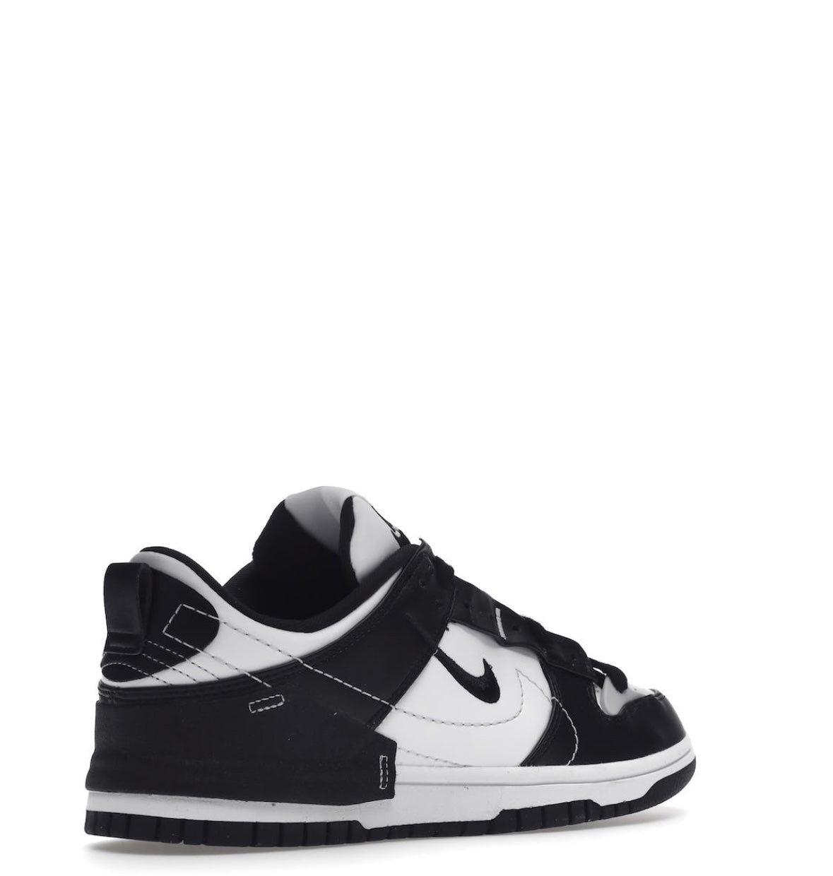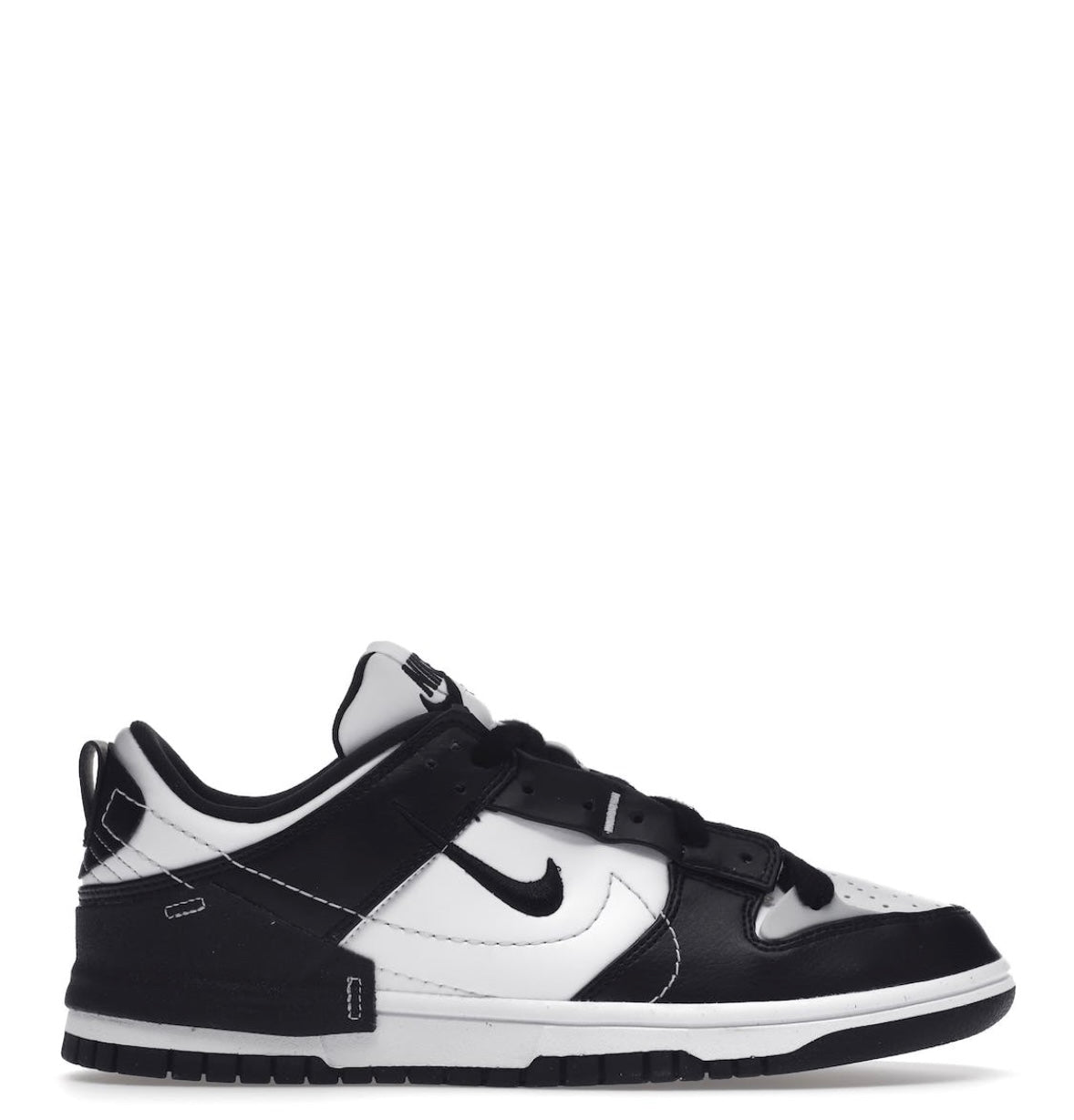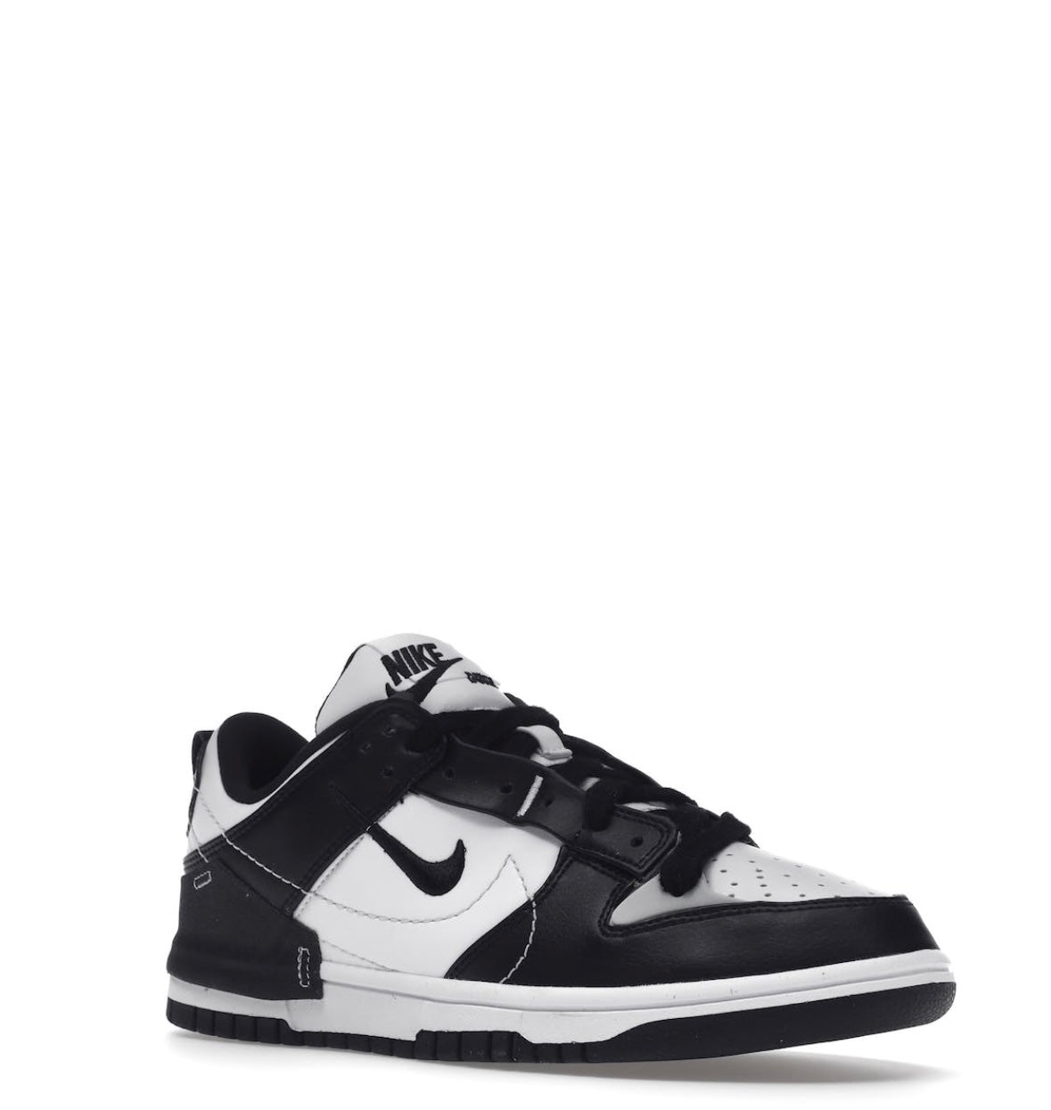 Nike Dunk Low Disrupt 2 Panda har en dekonstruerad överdel i vit canvas. Den förstärks av svarta läderinsatser som tar upp färgkoden för den ikoniska Dunk Low Black White. Det finns en TPU-förstärkning på hälen samt en extra öljett som sträcker sig över tåboxen och bekräftar silhuettens asymmetriska stil. Swoosh-formade sömmar omsluter panelerna och den broderade mini-swoosh. Det hela vilar på en vit sula med en svart yttersula av återvunnet material.