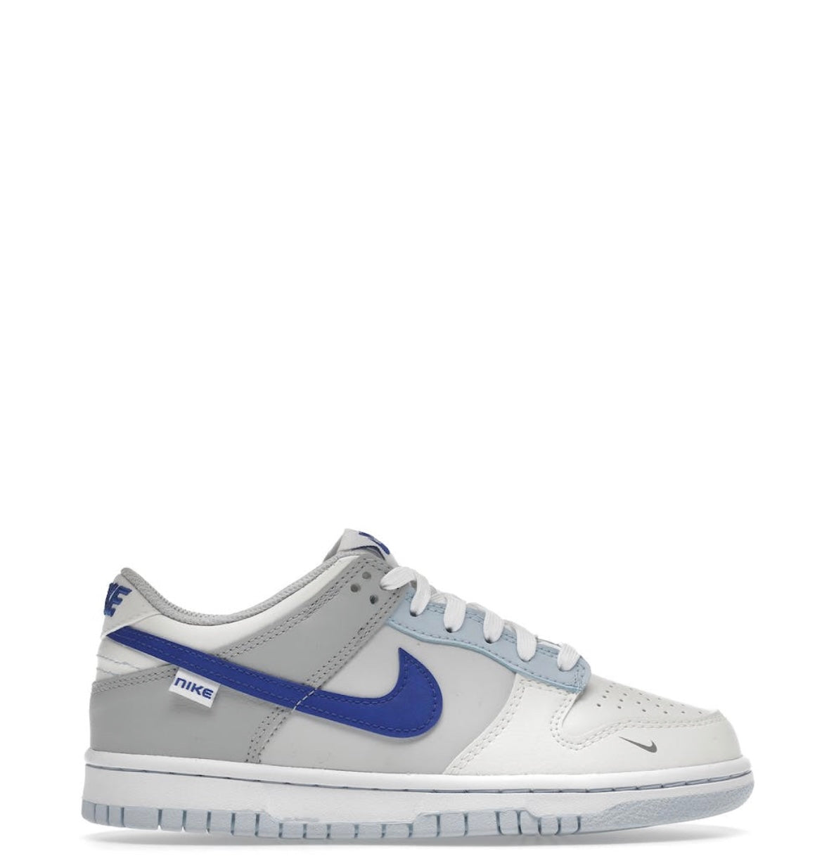 Nike Dunk Low Ivory Hyper Royal har en ovandel i läder klädd i olika nyanser från grått till ljusblått till krämfärgat. Sidans Swoosh ger kontrast i en kungsblå färg som matchar märket på hälen. Det hela kompletteras med en vit mellansula åtföljd av en isig yttersula.