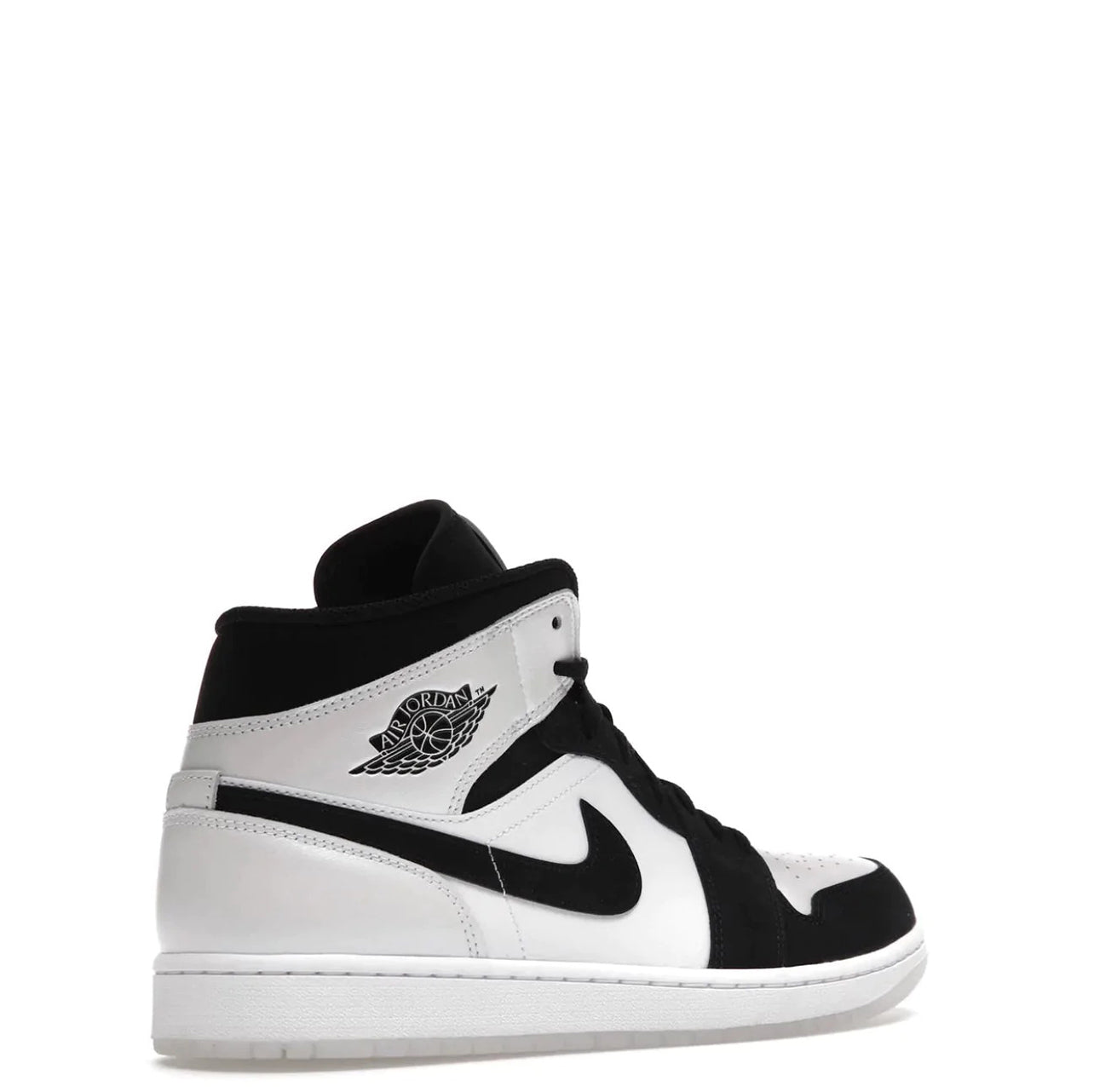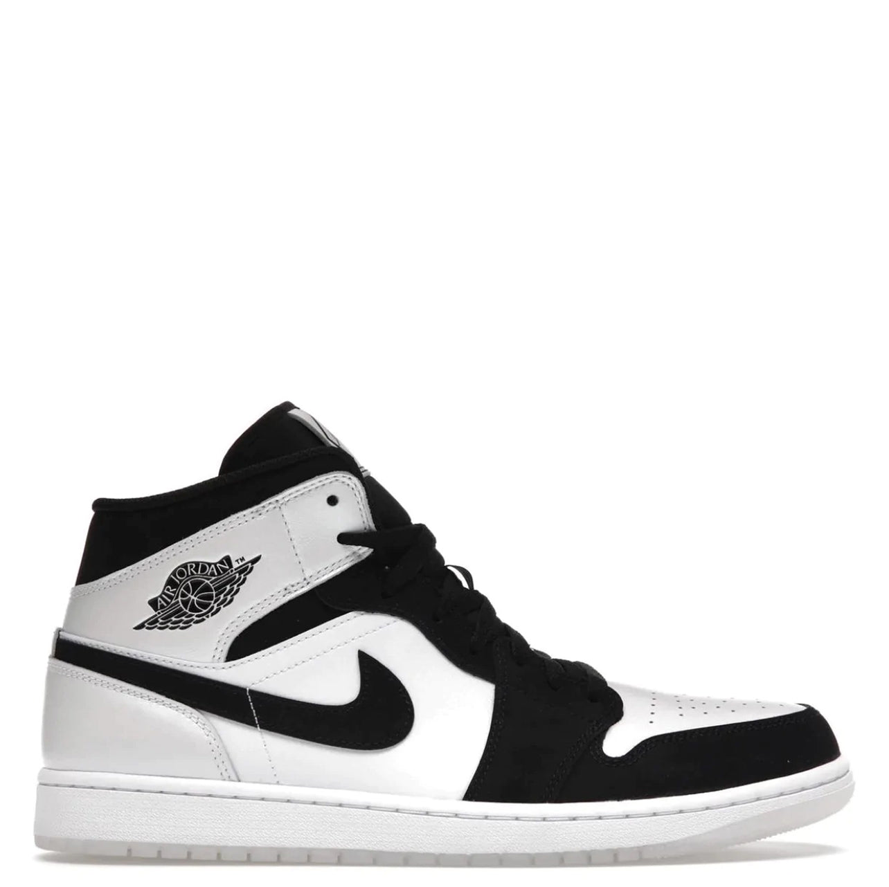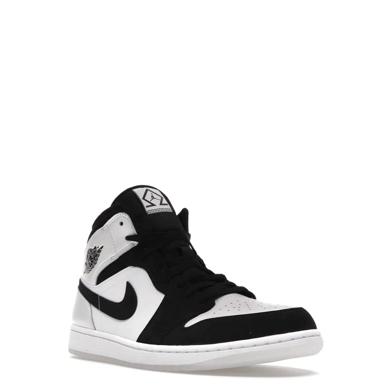 Air Jordan 1 Mid Diamond-shortsene kommer med en glat hvid læderoverdel med sorte Durabuck-overlays, og Nikes berømte Swoosh pryder siden af disse Dunks med sin sorte farve perfekt. Ved anklen ses et traditionelt Wings-logo ved oprindelsen af Air Jordan-kollektionen.