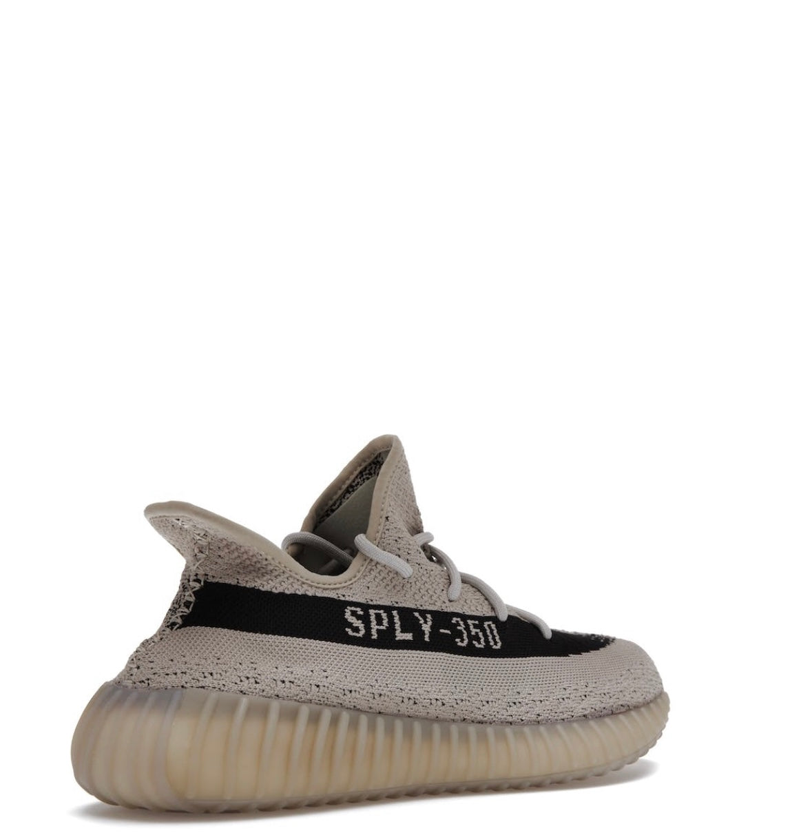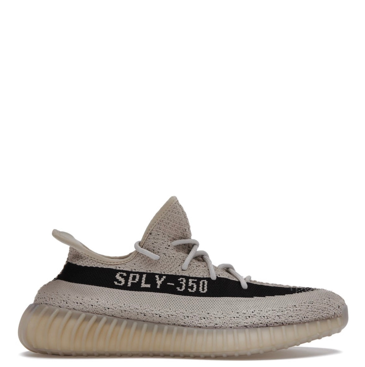 Adidas Yeezy Boost 350 V2 Skifer lancerer en beige Primeknit base med grå snørebånd. En sort sidestribe, med inskriptionen " SPLY-350 ", pryder det ydre panel. Det hele hviler på en gennemsigtig sål med BOOST-dæmpning.