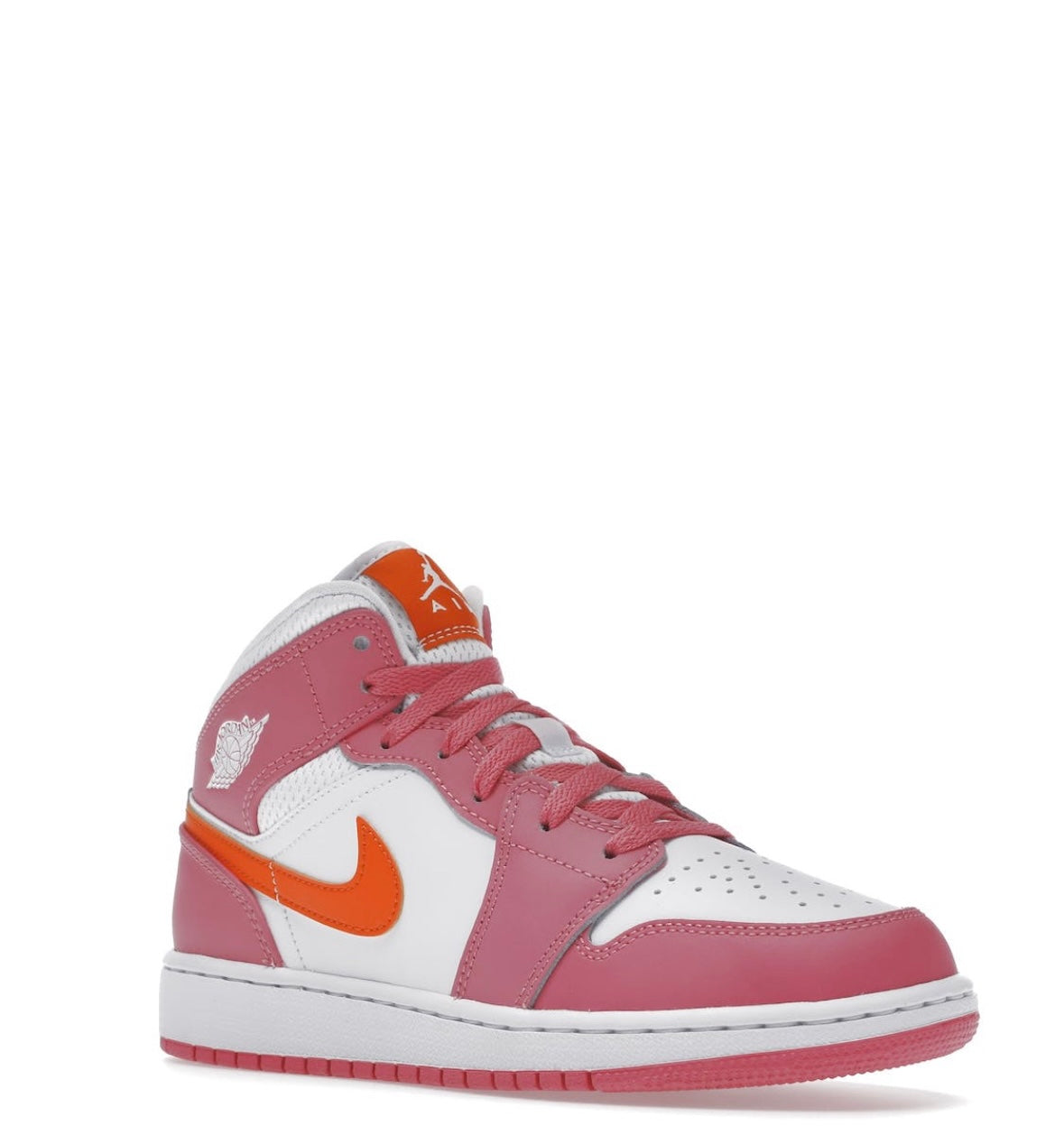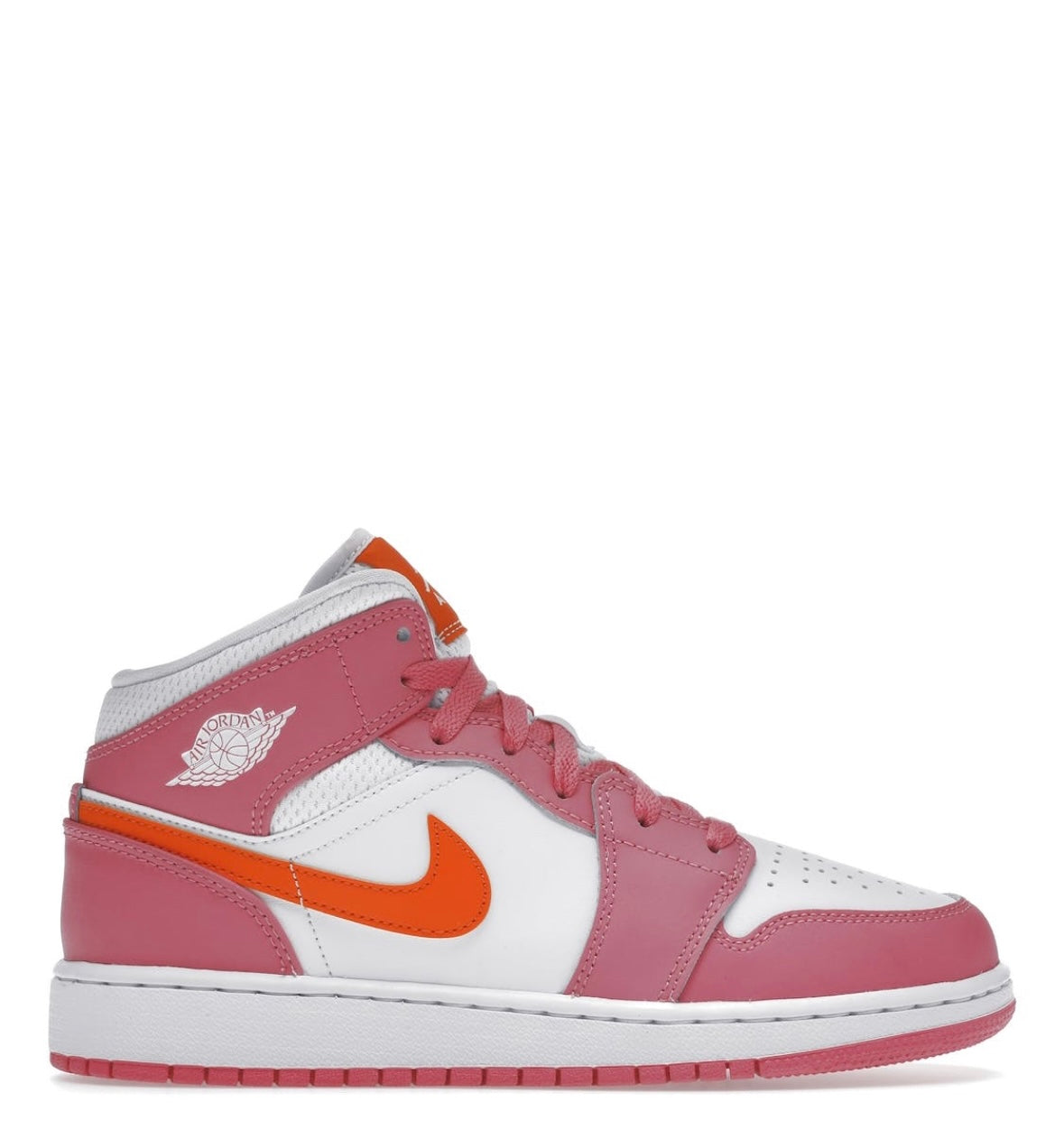 Air Jordan 1 Mid Pinksicle Safety Orange har en hvid læderbase suppleret med lyserøde læderoverlays. Adskillige orange detaljer lander på sideswooshen og Jumpman-logoet på pløsen. En hvid sål fuldender det farverige design!